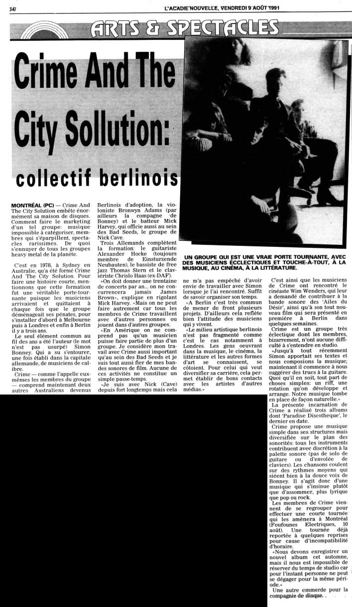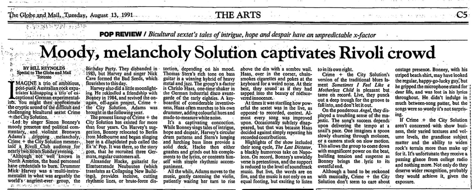 London late 1984. Ex-Birthday Party member Rowland S.Howard is recruited on guitar. After the demise of the Birthday Party in August 1983 Rowland had done basically nothing, except for guesting with Fad Gadget on stage at the Royal Albert Hall, London (on 30-Sep-83 and 01-Oct-83) in support of Siouxsie and the Banshees, joining the same Fad Gadget for the recordings of his "Gag" album in November 1983 and finally guesting at two Kas Product live concerts in France in April 1984. His brother Harry joins Crime on bass. Harry had replaced Tracy Pew in The Birthday Party at several UK live concerts during April/May 1982 when Tracy was serving time in an Australian prison. Epic Soundtracks (a.k.a. Kevin Paul Godfrey) [of Swell Maps, Red Crayola and Mute Records employee] will only join on drums as of their first live gigs in May 1985. During the life span of Crime and the City Solution (1985-1991), Mick Harvey continues to play an important role in Nick Cave's Bad Seeds. He is deviding his time between Bad Seeds and Crime. As a consequence, Crime only functions around Harvey's other commitments. |