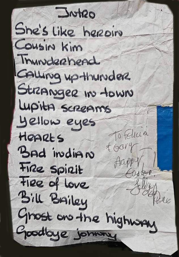 17-Oct-87 Setlist: Walking With The Beast/ Bad Indian/ My Cousin Kim/ Thunderhead/ Fire Of Love/ Lupita Screams/ Yellow Eyes/ Hearts/ Fire Spirit/ Bill Bailey/ Ghost On The Highway/ Sleeping In Blood City/ Crab Dance/ She's Like Heroin To Me. |