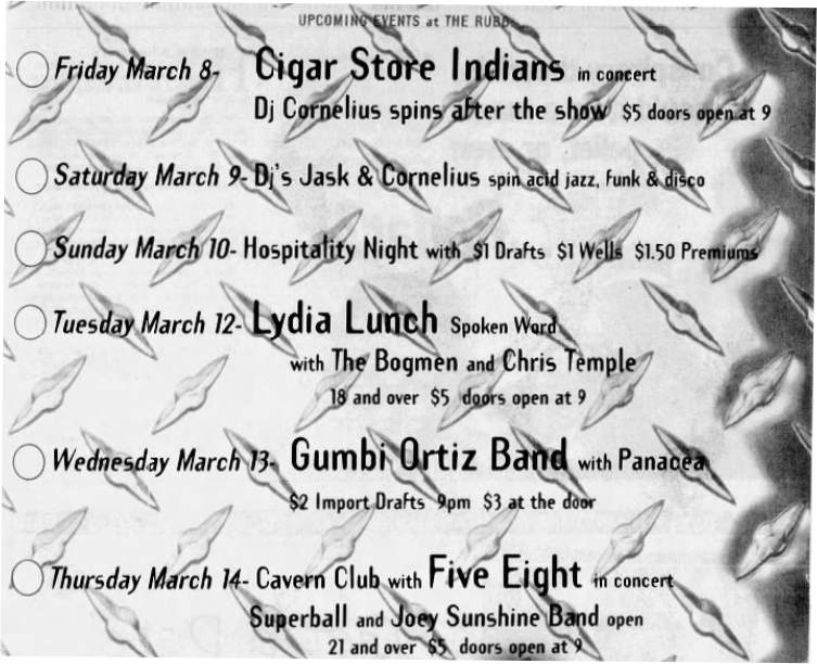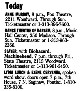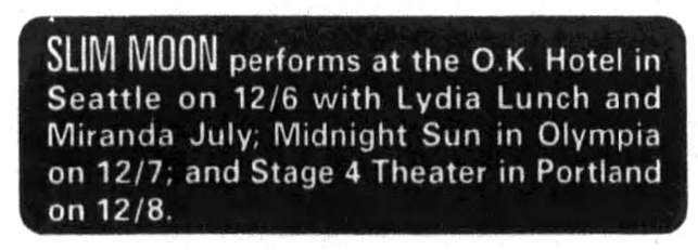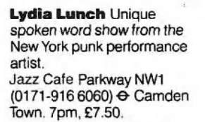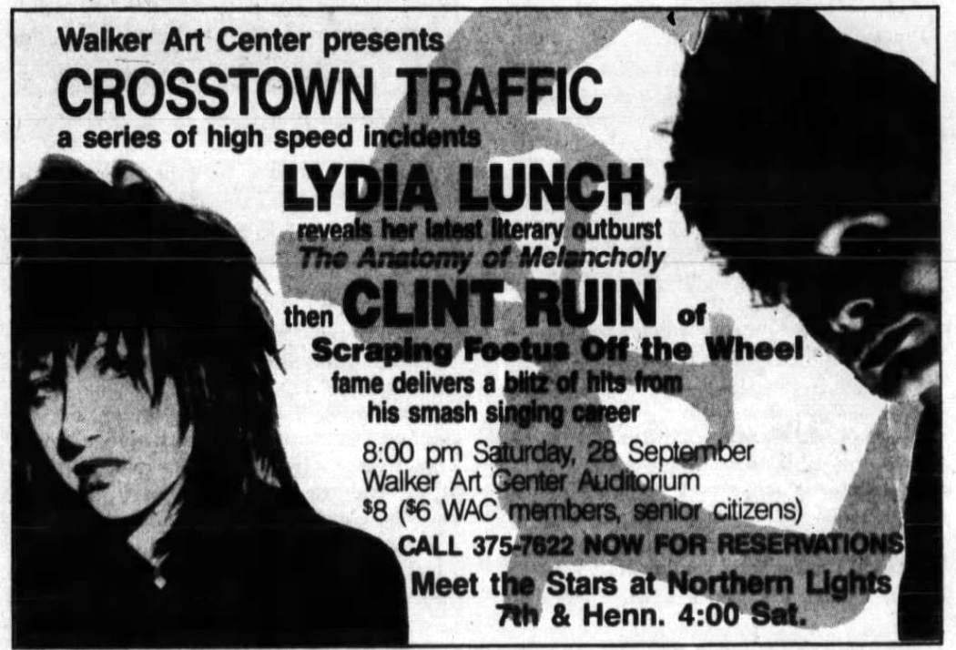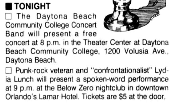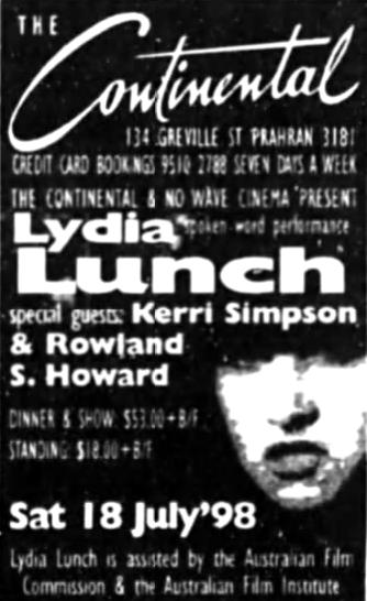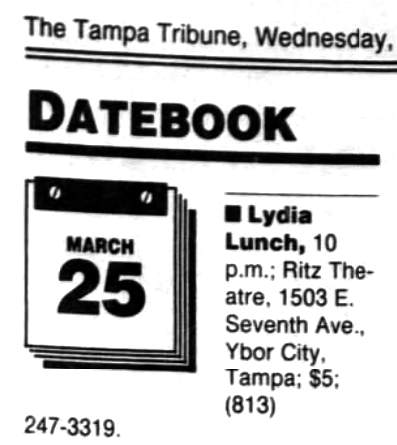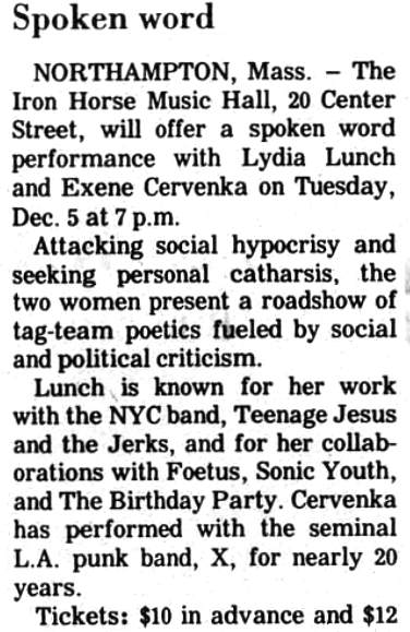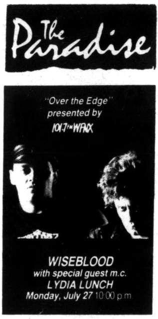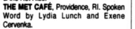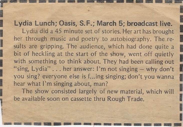 Note: Part of a US reading tour. Lydia Lunch with Jim Sclavunos (sax/keyboard) and pre-recorded backing tapes. Setlist also included tracks from the "In Limbo" mini album (recorded November 1982, released September 1984).