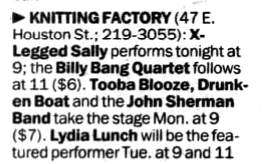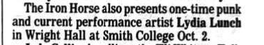 Note: Lydia does a spoken word show and later joins Sonic Youth on "Death Valley '69". She ends up getting paid twice by the promoter, Ruth Polsky. Ruth died in 1986, when she was hit by a runaway taxi that left her pinned against the front of the Limelight club. She was thirty one years old. (from "Lydia Lunch- The War Is Never Over", a book by Nick Soulsby (Jawbone, 2020).