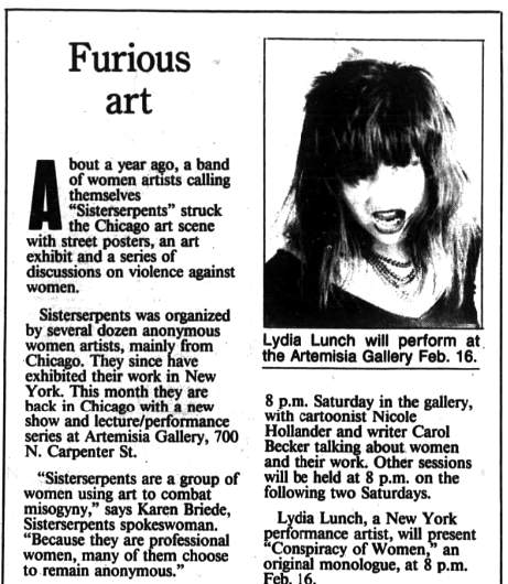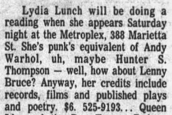 Note: Lydia doing a lecture on "Music Theory" and presenting her "Queen of Siam" album (ZE Records). On 20-Nov-79 Vivienne Dick screens her "Beauty Becomes The Beast" Super-8 film (41 mins) in which Lydia Lunch has the main role.