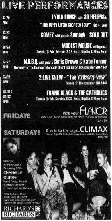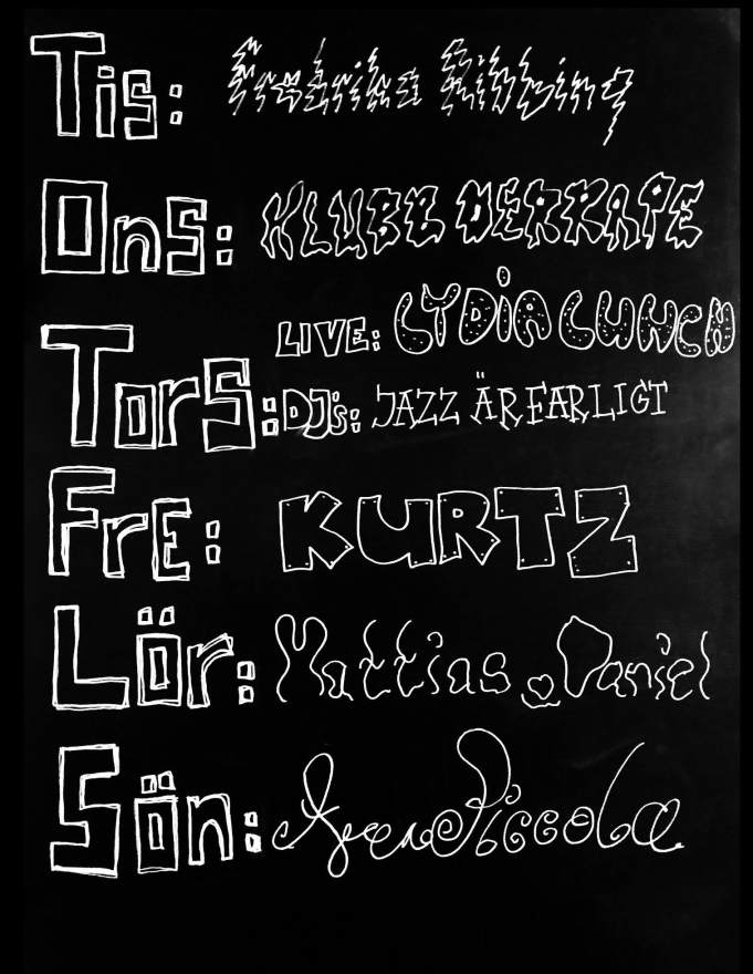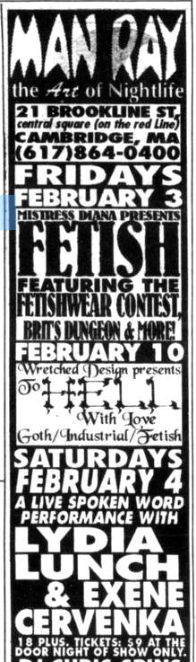 Note 1: "Why you murder me productions presents the dynamic team of Lunch and Rollins versus you. Are you one of the chosen few and will you survive the test? Think and then think again. First in a series of multiple assaults yet to come." Assault theater in which a bouncer would pick unsuspecting people from the audience/street, escort them to a pitch black room of the club where they would be subjected to a special performance by Lydia and Henry. One-off performance, never repeated.
