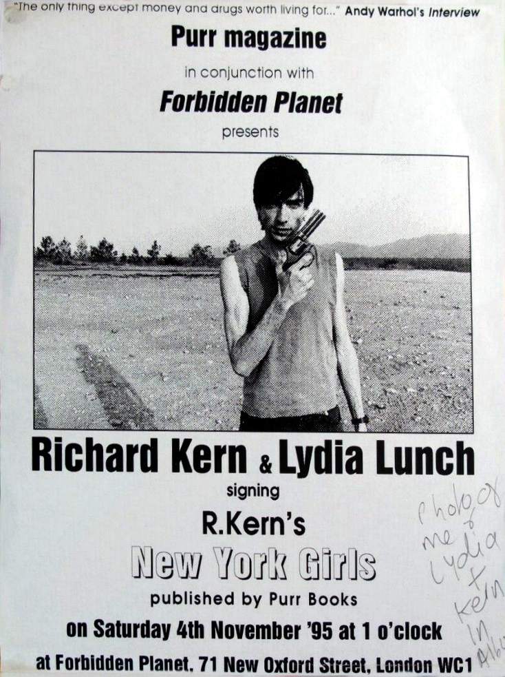 Note: By May 1984 Lydia had returned from a 2-year stay in London and she meets film maker Richard Kern with whom she would be collaborating a lot for the next 3 years. "The first [reading] I witnessed was in the basement of the Pyramid club in the East Village. During Lydia's monologue, [Tommy] Bloodboy [Turner] ran out of the crowd screaming at Lydia that what she was doing was not real art and then proceed to [supposedly] chop his hand off with an axe, his arm shooting blood everywhere. People were freaked. It was very impressive." Quote from Thurston Moore [Sonic Youth] as noted in "Ripped, t-shirts from the underground", a book edited by Cesar Padilla.