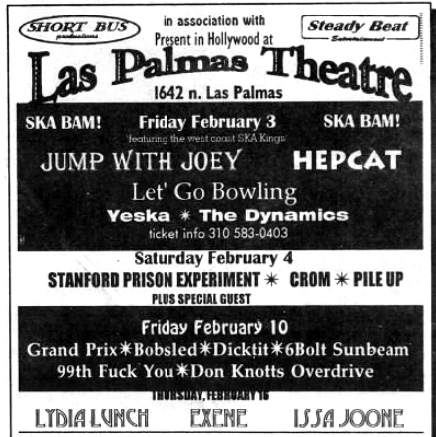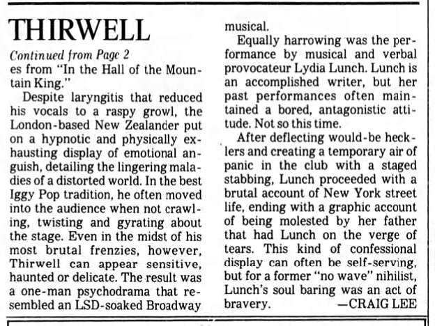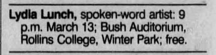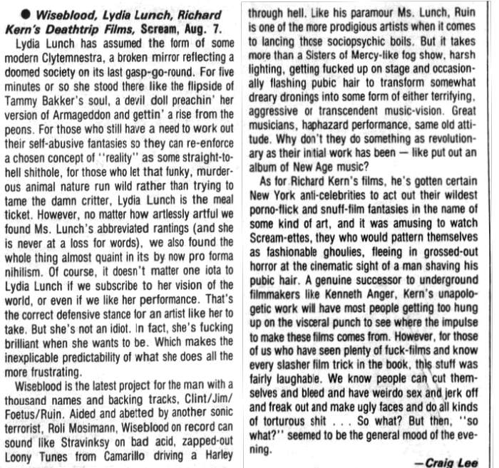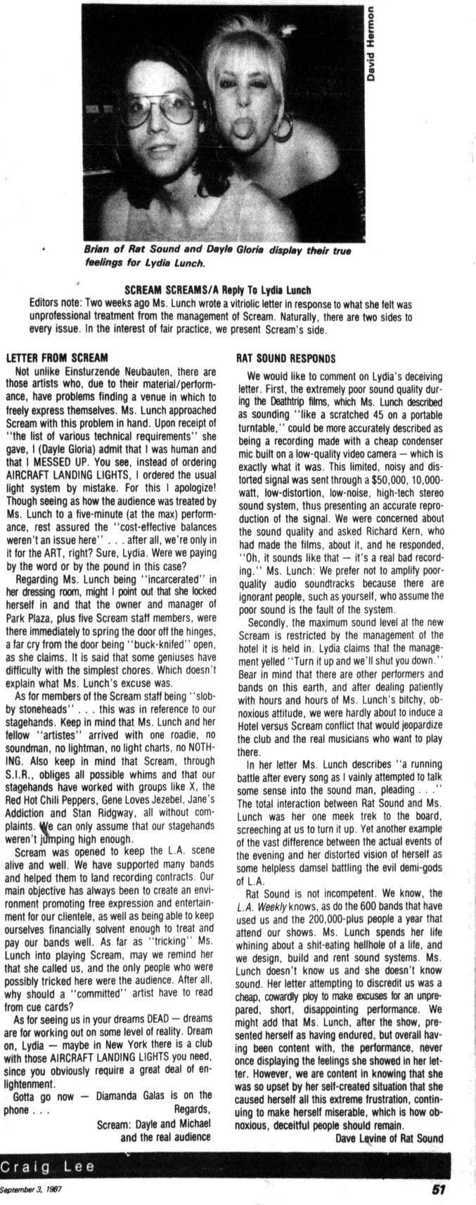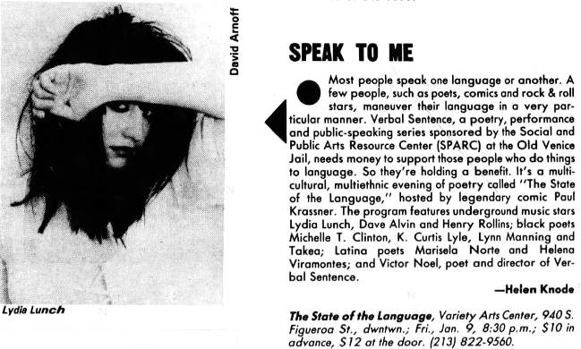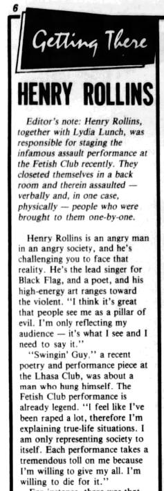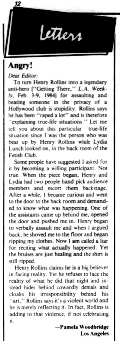 Note 2: L.A. Weekly's "La Dee Da" column the next weeks were full of outrage directed at Lunch and Rollins. LA Weekly 13-Jan-84 and LA Weekly 03-Feb-84 and LA Weekly 17-Feb-84.