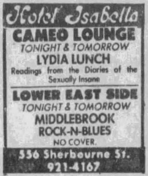 11-Aug-84 CA ON,Toronto,Hotel Isabella-Cameo Lounge (1st show @ 8PM and 2nd show @ 11PM) The Intimate Diaries of the Sexualy Insane
