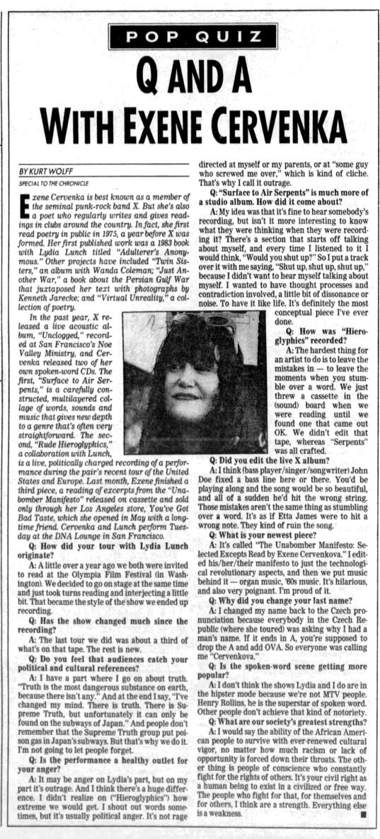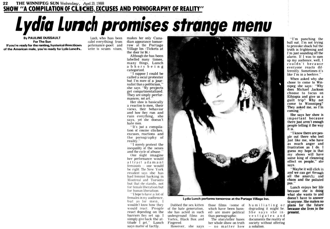 Note: (*) Broadcast on Canadian CKLN radio as part of a one hour interview with Lydia Lunch.