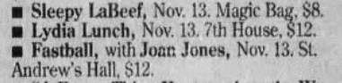 Lydia Lunch leaves San Francisco and moves to Pittsburgh in April 1995. She stays until December 1999. |