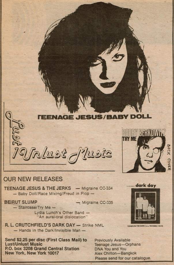 Beirut Slump co-exists partialy at the same time as Teenage Jesus & The Jerks. They rehearse for most of the time they exist (@ Kristian Hoffman and Bradly Fields' place on 240 Grand Street, New York City), but end up doing only 4 live concerts and one recording session. Apparently Diego Cortez (aka James Allan Curtis, director of the illustrious "Grutzi Elvis" 1978 feature film) was their manager. In this band Lydia does not sing, vocal duties are taken by Bob Swope. Bobby Swope was one of the St.Petersburg (FL) Eckerd College crew (like Arto Lindsay, Connie Burg, Marc Cunningham and Gordon Stevenson). It's around this time that Lydia starts starring in (Irish born) Vivienne Dick's Super-8 films. |