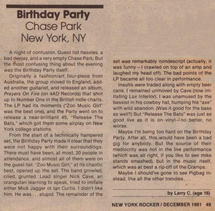 20-Jun-81 Setlist: (not in this order:) Figure Of Fun/ Cry/ Nick The Stripper/ Blast Off/ Zoo-Music Girl/ (Sometimes)Pleasure Heads Must Burn/ King Ink/ A Dead Song/ Release The Bats. |