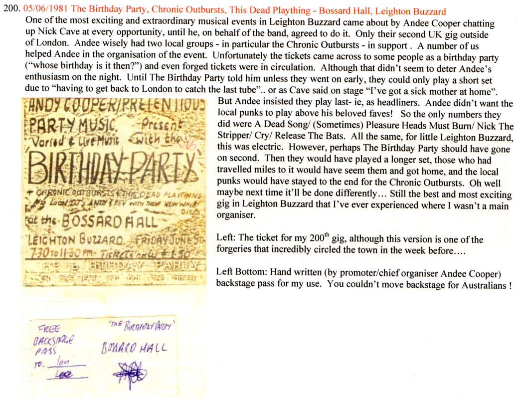 01-May-81 Setlist: Nick The Stripper/ Happy Birthday/ (Sometimes)Pleasure Heads Must Burn/ The Friend Catcher/ Figure Of Fun/ Yard/ Rowland Around In That Stuff/ A Dead Song/ King Ink/ Release The Bats/ Cry/ Catman [Gene Vincent]. |