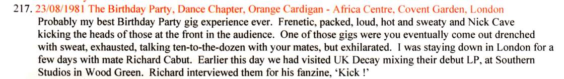 19-Jun-81 Setlist: King Ink/ Blast Off/ Happy Birthday/ Zoo-Music Girl/ Nick The Stripper/ A Dead Song/ Release The Bats/ (Sometimes)Pleasure Heads Must Burn/ Cry/ Catman [Gene Vincent]. |