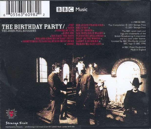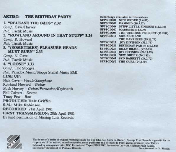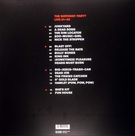 Note: Tracks 4,9,10 originally released on the "Drunk On The Pope's Blood" 12" (omitting the 4th track "Loose"). Tracks 11-16 sourced from a Radio Bremen (DE) -Pop 3- FM broadcast, and available on several bootleg LPs. Track 17 has Jim G. Thirlwell on sax. The only band approved Birthday Party live album.