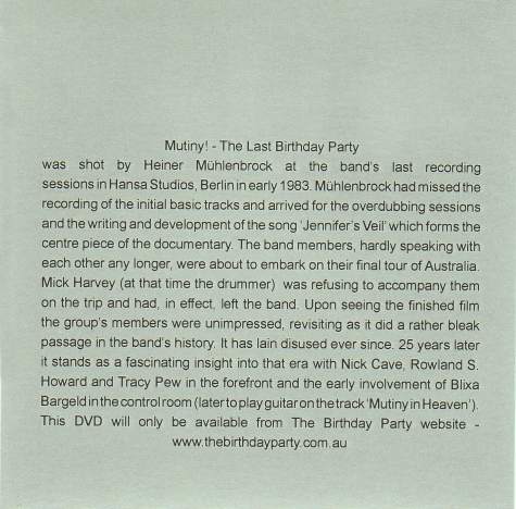 Recording info: Disc 1. Boys Next Door (live footage) 28-Apr-78 Melbourne-Preston,Preston Institute of Technology Alternative Animals festival/ 09-Jun-78 Melbourne-Hawthorn,Swinburne College of Technology,Ethel Hall New Wave Night; Birthday Party (live footage): 04-Nov-81 Amsterdam,Melkweg/ 17-Nov-81 Köln,Bürgerhaus Stollwerck,Machinenhalle/ 19-Feb-82 Melbourne-St.Kilda,The Seaview Ballroom/ 27-Jun-82 Bochum,Zeche/ 21-Jul-82 Hilversum,VPRO TV studios "Götterdämmerung 2000" TV show/ 22-Jul-82 Manchester,Hacienda/ 25-Nov-82 London-Brixton,The Ace Cinema/ 06-Apr-83 MN,Minneapolis,First Avenue/ April-83 Berlin,Hansa Ton studios,sessions for "Mutiny!" EP/ 14-May-83 Sydney,Trade Union Club/ 21-May-83 Melbourne,The Venue.