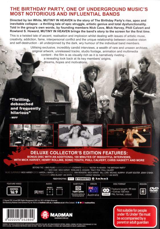Disc 2. Interviews with Phill Calvert (23:42)/ Henry Rollins (5:53)/ Thurston Moore and Steve Shelley [Sonic Youth] (12:10)/ Clinton Walker [writer] (8:20)/ Mick Harvey (22:41)/ Paul Goldman (13:19)/ Chris Hasket [Rollins Band] (6:05)/ Christoph Dreher [Die Haut] (9:02)/ David Yow [The Jesus Lizard] (5:28).