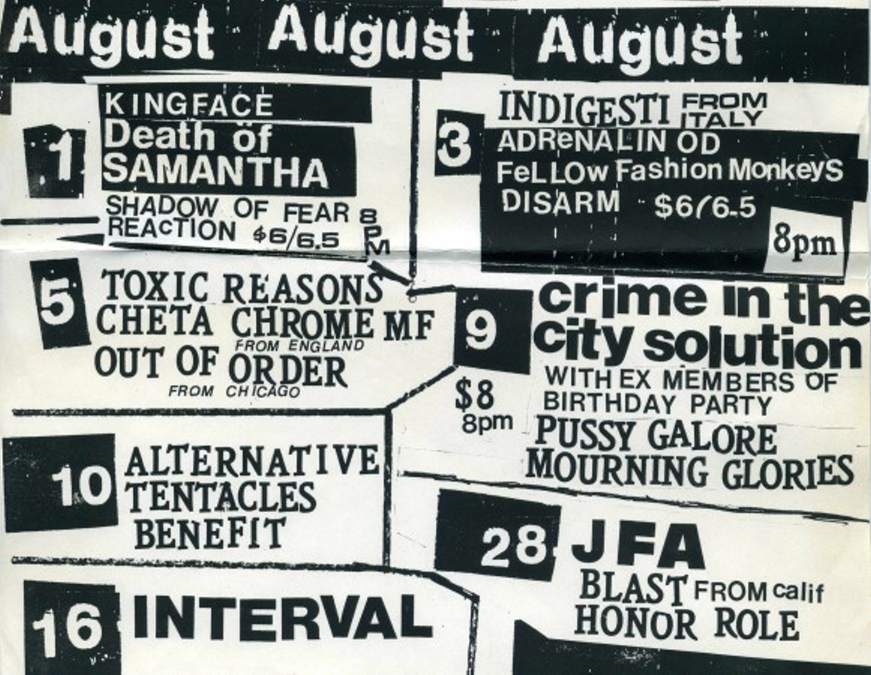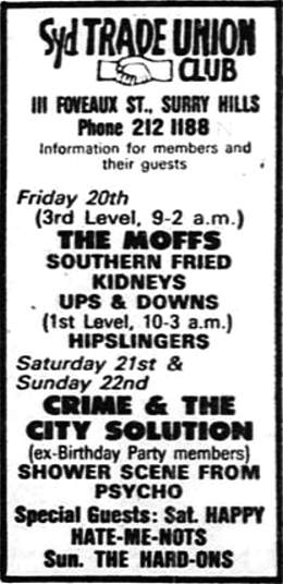 xx-Dec-79 Note: Chris Astley was sacked and his friend Kim Beissel leaves with him. The rest got another guy in on baritone sax for this concert. After this, the band breaks up. Lyndsay O'Meara returns to Sydney joining Wild West (1980), Pel Mel (1981) and The Tame O’Mearas (1981). Kim Beissel compiled two volumes of "Original Seeds: Songs That Inspired Nick Cave And The Bad Seeds" (1998/2004). By late 1983 Simon Bonney and Bronwyn Adams move to London. Only by 1985, C&CS (Mk III) would be erected once more. |