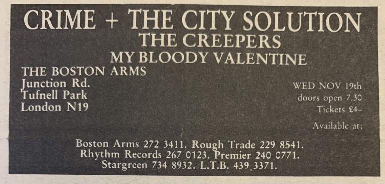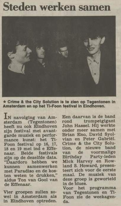 London late 1984. Ex-Birthday Party member Rowland S.Howard is recruited on guitar. After the demise of the Birthday Party in August 1983 Rowland had done basically nothing, except for guesting with Fad Gadget on stage at the Royal Albert Hall, London (on 30-Sep-83 and 01-Oct-83) in support of Siouxsie and the Banshees, joining the same Fad Gadget for the recordings of his "Gag" album in November 1983 and finally guesting at two Kas Product live concerts in France in April 1984. His brother Harry joins Crime on bass. Harry had replaced Tracy Pew in The Birthday Party at several UK live concerts during April/May 1982 when Tracy was serving time in an Australian prison. Epic Soundtracks (a.k.a. Kevin Paul Godfrey) [of Swell Maps, Red Crayola and Mute Records employee] will only join on drums as of their first live gigs in May 1985. During the life span of Crime and the City Solution (1985-1991), Mick Harvey continues to play an important role in Nick Cave's Bad Seeds. He is deviding his time between Bad Seeds and Crime. As a consequence, Crime only functions around Harvey's other commitments. |