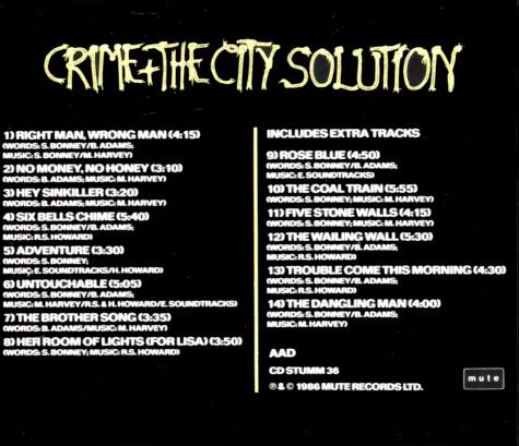 Note 1: This is Crime and the City Solution MkIII and was located in London. The initial band (1978) was located in Sydney (AU) and MkII (1979) in Melbourne (AU). In January 1985 Mick Harvey and Simon Bonney record a 2 song demo in Melbourne for Mute records.