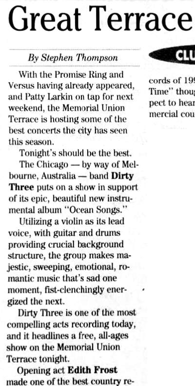Dirty Three record their wonderful "Whatever You Love, You Are" album in London in July. They wrap up the year by doing an ultra-short (6 dates) US tour, with Pavement in October.