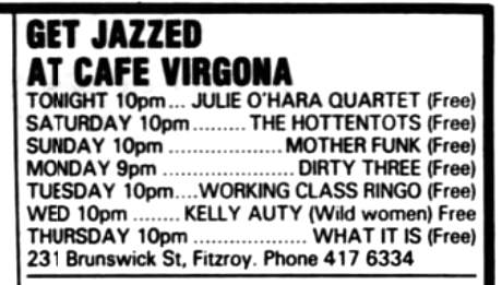 Note 1: First concerts at the bar of the Bakers Arms Hotel (@ 355 Victoria Street). The hotel opened in 1876, before that it was a bakery. The pub was then owned by Noel Fermanis who in later years also owned The Great Britain (in Richmond), the Builders Arms (in Fitzroy), the Montague (in South Melbourne), The Retreat Hotel (in Abbotsford), the Windsor Castle (in Windsor), Yelza (in Fitzroy), the Edinburgh Castle (in Brunswick), the Wesley Anne (in Northcote) and the Royal Oak Hotel (in Fitzroy).