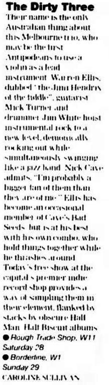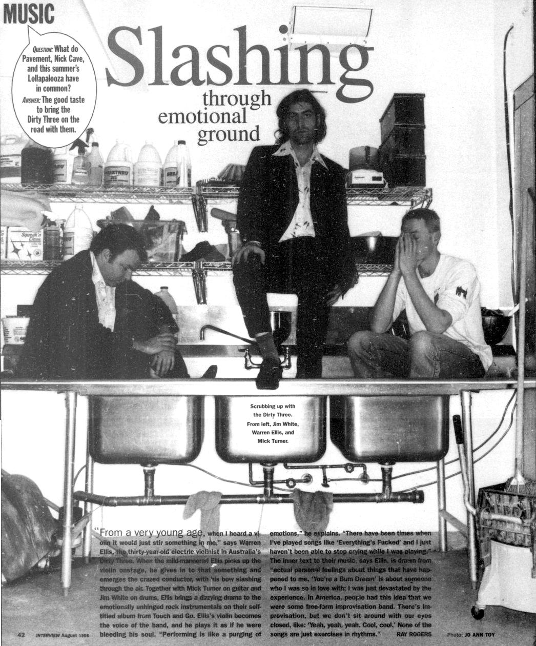 Note 3: "We got together because it helped us pay the rent. A friend of mine bought a bar in Melbourne, and rather than playing records, he wanted to have live music. I hadn’t seen him for about eight years or something, and when I bumped into him, he said he’d bought this bar and he knew I played music, so he said “Why don’t you get a group together and come down and play?” So, I’d just met Jim and Mick about two or three months before this took place, and we met up in my kitchen, worked out half a dozen songs, and went down and played there that night. That was kind of why we started really. We weren’t actually that focused: we just went down and played, we didn’t have a concept for the group or anything. These were just the instruments we played, there was no PA – and none of us could sing, so that wiped out vocals from the start." Warren Ellis interviewed by Damien Love in 1998.