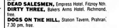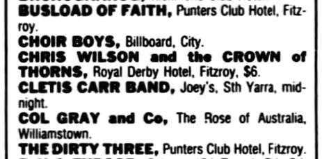 Note 5: " Warren Ellis was playing in [Kim Salmon's] Surrealists at the Great Britain hotel in Richmond when I suggested to Warren to form a band to play at a new pub I had in Abbotsford Melbourne. Warren was very keen and they started playing every Friday nite for I think 120$. They were poor musicians, they arrived in there old car with there equipment. Within a month or so they attracted a big crowd of say 100 people and it was a small pub. Their early style was very raw and the crowd loved it, they usually played for 2-3 hours. I had other music at the Bakers but they were the only stars." Noel Fermanis (email, 2024).
