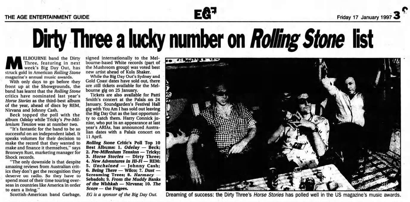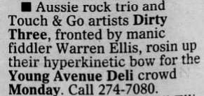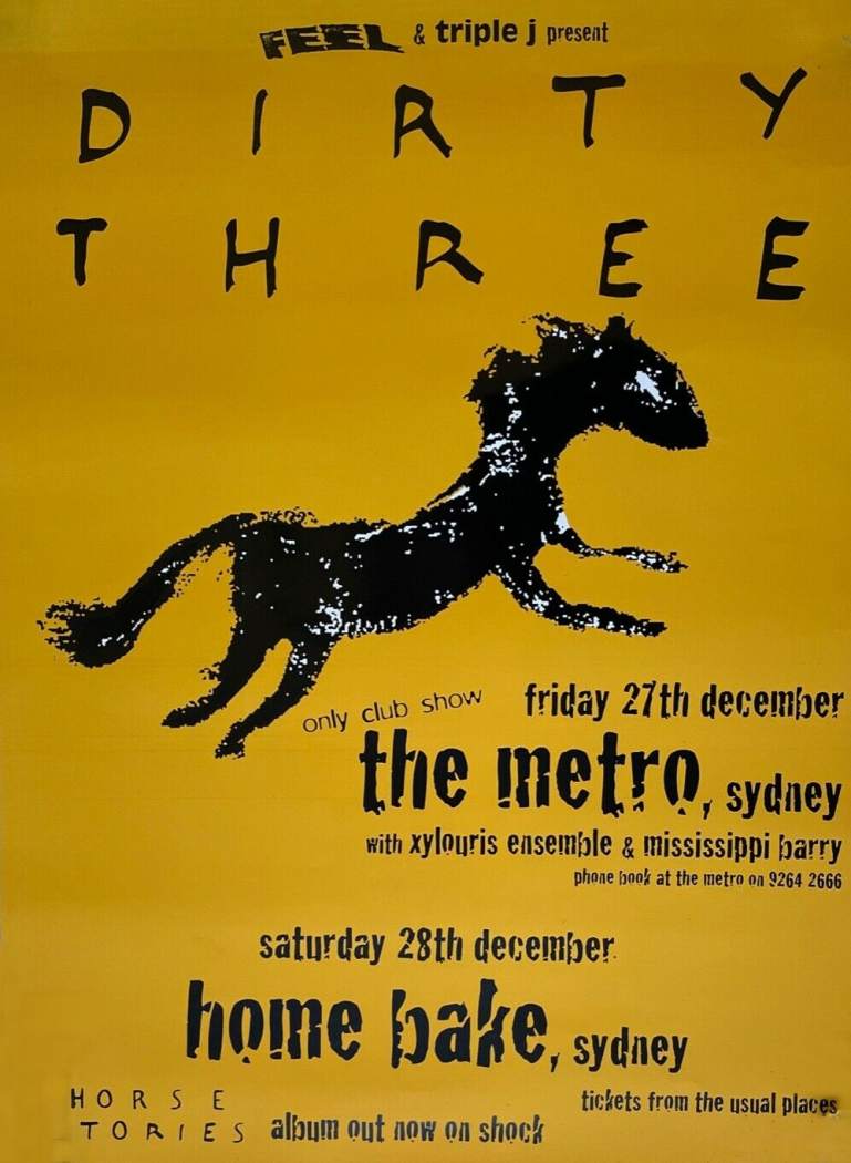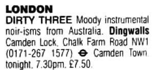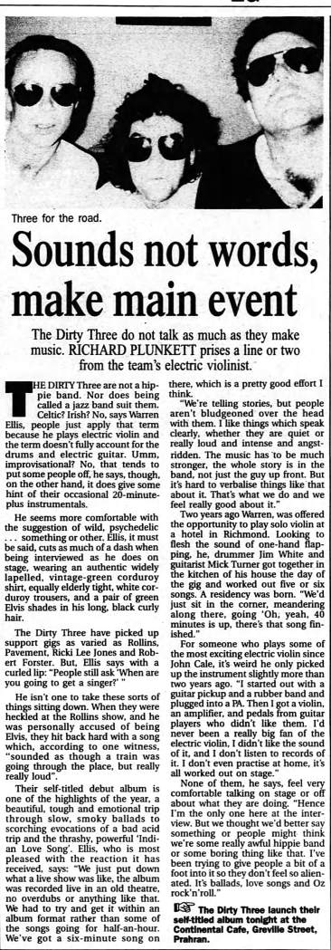 The year in which our 3 heroes form a band of their own, Dirty Three. Warren and Jim are also member of 4 other bands: Busload Of Faith, Kim Salmon's Trouble Makers, David McComb's Blackeyed Susans and Charlie Marshall's Body Electric. Mick and Jim are member of Venom P. Stinger.
