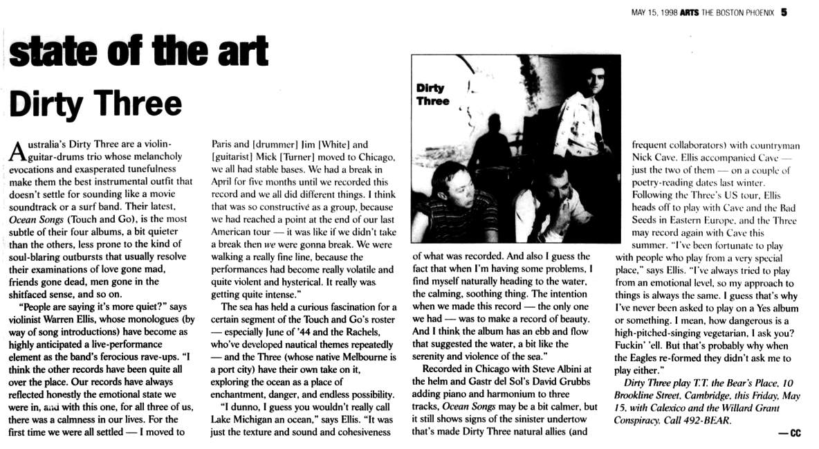 Nov-99 [EU Warren Ellis, Jim White and Susan Stenger [Band Of Susans] tour Europe as part of Nick Cave's 'little band'. No activity for Dirty Three.]