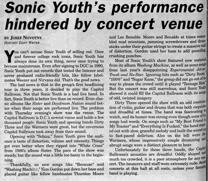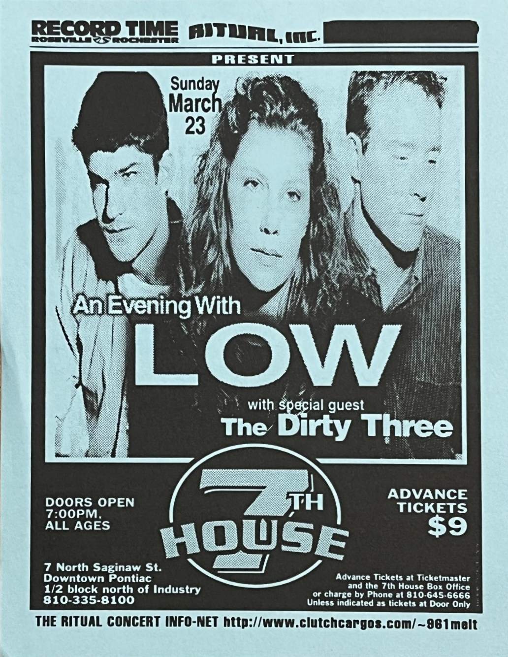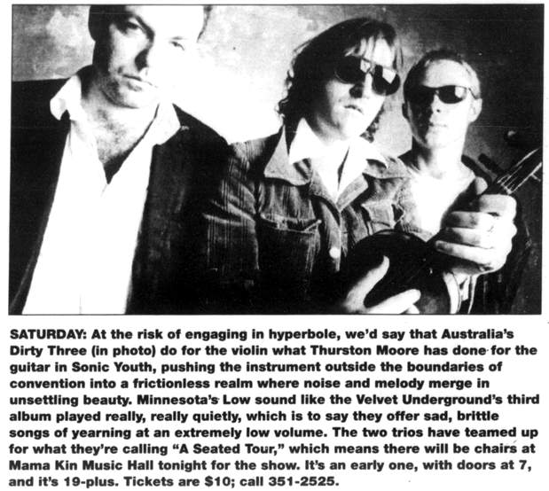 Note: Start of 8th tour of North America, first with Low, then with Pavement. Dirty Three was not advertised at the Salt Lake City show and after a packed show for Low, most everyone left. Dirty Three played in the middle of the room to a dozen or so.