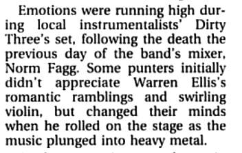 Note: "Some time in '97 [05-Dec-98,ed.], S.T.M bass player Andrew Entsch overdosed and died. His best friend and D3 sound mixer Norman Fagg was so grieved over the loss that he followed Andrew to an early grave. Norman did this just 24 hrs prior to the D3's 98 [1999,ed.] BDO appearance. That [Melbourne] show - with such an outpouring of grief and emotion - has got to be the best D3 show I've seen and an absolute BDO highlight. They were everything they are. Beautiful to the point of making you cry and completely cathartic with the rage that they can summon. The audience was stunned, overwhelmed. It was a real release for all the sorrow. Warren got blind that day and we ended up taking him to the hospital after he knocked himself out falling over a fence. It was a wild day. BDO has never had them back." Recollections by Tim Pittman [Feel Presents, concert promoters], Dirty Three's live agent from 1994-present.