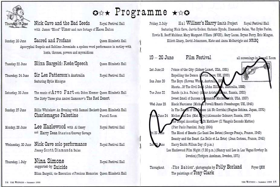 The festival ran from 17-Jun-99 till 02-Jul-99 at 3 locations: the Royal Festival hall, the Queen Elisabeth Hall and the Purcell Room. Performing were: Blixa Bargeld, Bonnie Prince Billy, Nick Cave and the Bad Seeds, Console, Dirty Three, Faust, Lee Hazlewood, Barry Humphries, Kleidler, Question Mark & the Mysterians, Nina Simone, To Rococo Rot, The Harry Smith Project featuring: Michael Blair, Eliza Carthy, Nick Cave, Jarvis Cocker, Adam Dorn, Bryan Ferry, Gavin Friday, Robin Holcomb, Gary Lucas, Kate & Anna McGarrigle, Eric Mingus, Geoff Muldaur, Mondrian Quartet, Maurice Seezer, Bobby Neuwirth, Beth Orton, Mary Margaret O´Hara, Van Dyke Parks, Renaud Pion, Roswell Rudd, Jimmy Scott Trio, Elliott Sharp, Syd Straw, June Tabor, David Torn and