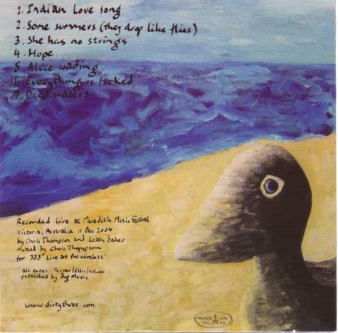 Tracklist: 1.Warren's Waltz(*) (6:50)/ 2.Kim's Dirt(*) (10:10)/ 3.Indian Love Song (12:11)/ 4.Forever Gone (a.k.a. The Last Night/Mick's Love Song) (5:25)/ 5.In Bed With The Dirty Three (8:58)// 6.Turk (10:45)/ 7.Jim's Dog(*) (8:54)/ 8.Short Break(*) (3:04)/ 9. (Dirty Three) Theme (2:26)/ 10.Monk's Lament (3:59)/ 11.You Were A Bum Dream(*) (6:27)/ 12.Turk reprise (*) (3:26).