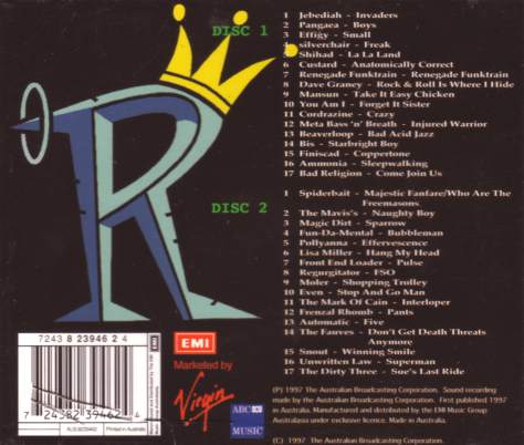 Note: All tracks recorded live @ The Domain, Sydney (AU) on 05-Nov-94. 16 bands performed 15-20 minute sets at an outdoor festival arranged as a fundraiser for the Big Backyard radio show.