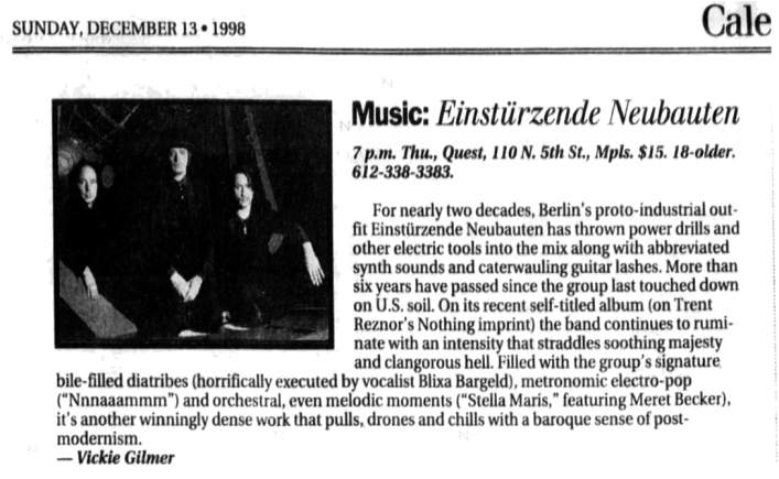 18-Jun-93 Note: Cancelled, because Blixa Bargeld was touring with The Bad Seeds. |