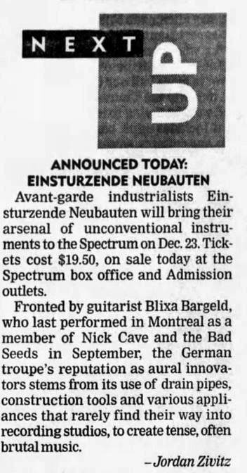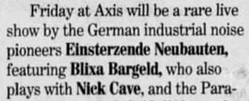 17-Jun-93 Note: Re-scheduled to 11-Sep-93, because Blixa Bargeld was touring with The Bad Seeds. |