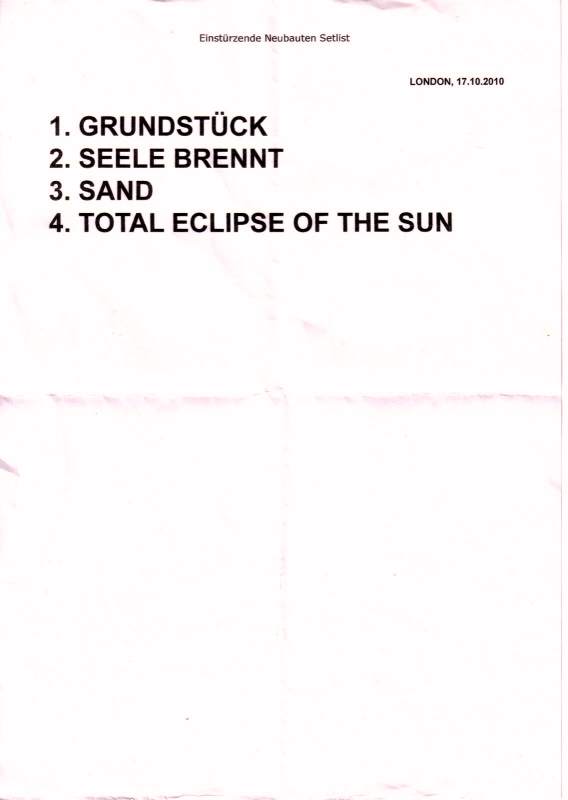 Setlist: Ein leichtes leises Säuseln/ Perpetuum Mobile [pm]/ Dead Friends (Around the Corner)/ Redukt/ Youme & Meyou/ (addressing loudmouth in the audience)/Neun Arme - Die Nacht/ Die Befindlichkeit des Landes/ Ein seltener Vogel/ Ozean und Brandung - Paradiesseits/ Haus der Lüge - Armenia/ Rampe:Good Morning Everybody/ Selbsportrait mit Kater/ Ich gehe jetzt/ Hex for Stevo Pearce (Some Bizzare) - Grundstück/ Rampe:Ich warte/ Sabrina/ Alles [m]. |