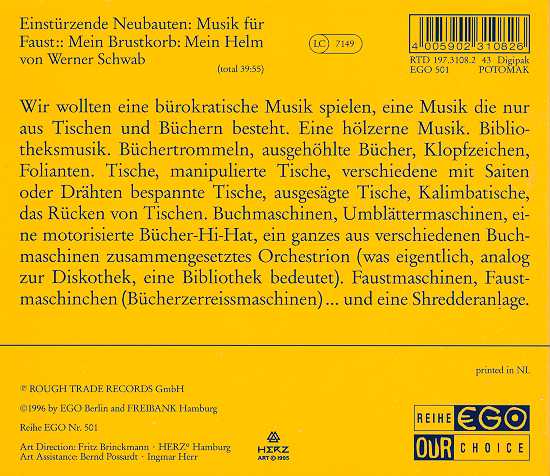 Notes: A theatre play "Faust-Mein Brustkorb:Mein Helm" by Werner Schwab with Thomas Thieme as Faust, Blixa Bargeld as Mephisto, Günter Rüger as Busho, Gabriele Völsch as Margarethen and music by Neubauten. Premiered on 29-Oct-94. EN Line-up: Blixa Bargeld, N.U.Unruh, FM Einheit, Marc Chung & Alex Hacke.