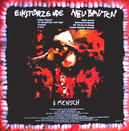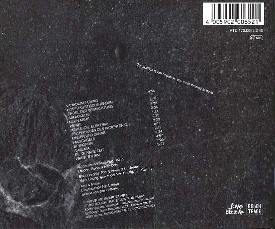 Notes: Line-up: Blixa Bargeld, N.U.Unruh & FM Einheit (+ Mark Chung bass on some tracks). Initial copies came with a 16-page booklet containing lyrics and a discography. (*) Also available on the "80-83 Strategies Against Architecture" compilation album on Mute records. "Jet'm" is a cover of "Je t'aime...moi non plus" (S.Gainsbourg).