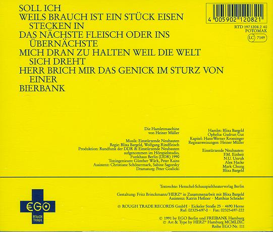 Notes: Lyrics and vocals on "Blume (French version)" by Diana Orlof, lyrics and vocals on "Blume (English version)" by Anita Lane, lyrics and vocals on "Blume (Japanese version)" by Etsuko Sakamaki-Haas. Thomas Wydler (Bad Seeds & Die Haut) snare drums on "Ubique Media Daemon". All tracks, except "Ring My Bell" originally composed for "Infante, c'est Destroy" a ballet-piece by the Canadian La La La Human Steps which premiered in Paris @ the Théâtre de la Ville in Apr-91. Line-up: Blixa Bargeld, N.U.Unruh, FM Einheit, Marc Chung & Alex Hacke.
