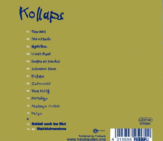 Notes: Line-up: Blixa Bargeld, N.U.Unruh & FM Einheit (+ Mark Chung bass on some tracks). Includes "Negativ Nein","Schiess euch ins Blut" and the "Stahldubversions" tape (originally Rip Off- RIP6,1982) as extra tracks. "Hören mit Schmerzen" is here re-titled to "Schmerzen hören". "Jet'm" (track 7, but not listed on the CD) is a cover of "Je t'aime...moi non plus" (S.Gainsbourg). (*) Also available on the "80-83 Strategies Against Architecture" compilation album on Mute records. Album + extra tracks remastered by Michael Schwabe @ Monoposto (MS & Jon Caffery's studio),Düsseldorf in 2002. Best sounding and most complete CD version of the "Kollaps" album, although it does not contain "Negativ Nein" (recorded live @ the "Mythen,Monster, Mutationen" festival at the Tempodrom, Berlin on 26-Jun-87).