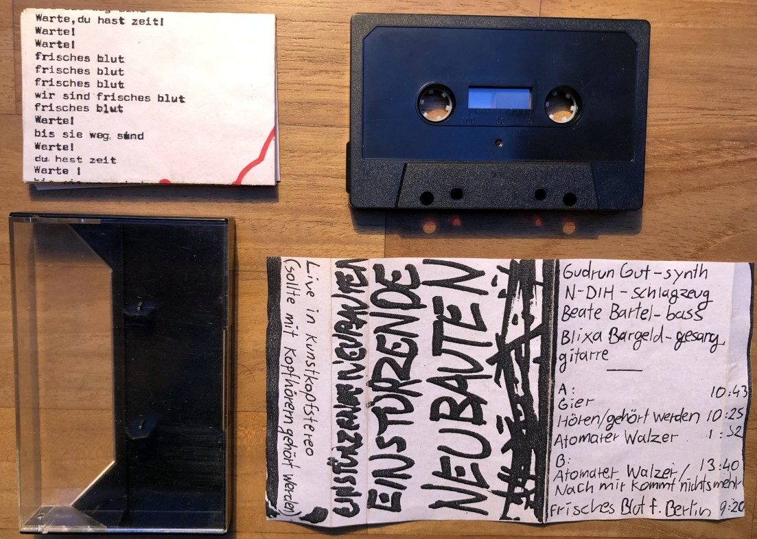 Notes: 40 minute live recording of their first concert. Comes with insert sheet with lyrics to "Frishes Blut für Berlin". Sold in Blixa's Eisengrau shop on Goltzstrasse,Berlin. Line-up: Blixa Bargeld (vocals)/ Beate Bartel (bass)/ Gudrun Gut (synthesiser) & N.U. Unruh (real drums). Gudrun & Beate were at the time also in Mania D.
