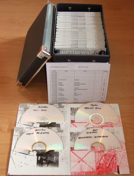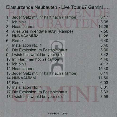 All 5 concerts between 24-Oct-04 and 04-Nov-04 (A-Krems, I-Reggio Emilia and D-Berlin) were recorded by the band, 3 (not 03/04-Nov-04) of these concerts where burned on CD-R and sold immediately after the concert. Later more copies (with a maximum of 250 in total) were sold through Neubauten.org. (*) not on the CD-R.