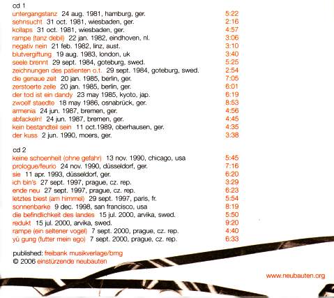 Tracklist: Untergangstanz/ Sehnsucht/ Kollaps/ Tanz Debil/ Negativ nein/ Blutvergiftung/ Seele brennt/ Zeichnungen des Patienten O.T./ Die genaue Zeit/ Zerstörte Zelle/ Der Tod ist ein Dandy/ Zwölf Städte/ Armenia/ Abfackeln!/ Kein Bestandteil sein/ Der Kuss// Keine Schönheit (ohne Gefarhr)/ Prolog-Feurio!/ Sie/ Ich bin's/ Ende neu/ Letztes Biest (am Himmel)/ Sonnenbarke/ Die Befindlichkeit des Landes/ Redukt/ Rampe: ein seltener Vogel/ Yü-Gung (futter mein Ego).