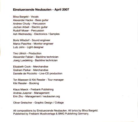 18 (out of 19) concerts between 27-Mar-05 and 21-Apr-05 were recorded by the band, burned on CD-R and sold immediately after the concert. Later more copies (with a maximum of 250 in total) were sold through Neubauten.org. (*) not on the CD-R.