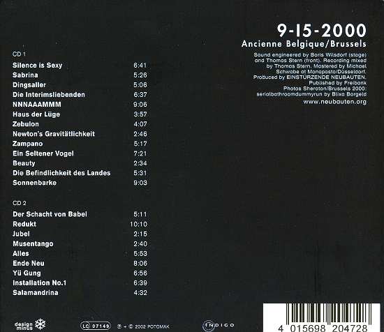 Recording info: Recorded live @ the Ancienne Belgique,Brussel on 15-Sep-00 by Boris Wilsdorf & Thomas Stern. Mastered by Michael Schwabe @ Monoposto (MS & Jon Caffery's studio),Düsseldorf in Autumn 2002.