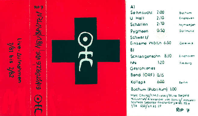 Notes: 46 minute live tape. Comes with colour fold-out cover. All in mono, except track 6 in Kunstkopfstereo. Line-up: Blixa Bargeld (vocals)/ Beate Bartel (bass)/ Gudrun Gut (synthesiser) & N.U. Unruh (real drums), and Bettina Köster (sax) on track 4. Gudrun, Beate & Bettina were at the time also in Mania D.