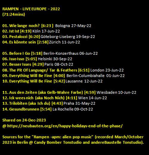 Tracklist: Rampe (Jeder Satz mit ihr hallt nach)/ Ich bin's/ Headcleaner/ Alles (was irgendwie nützt)/ NNNAAAMMM/Redukt/ Installation No.1/ Die Explosion im Festspielhaus/ I Wish This Would Be Your Colour (a.k.a. Sabrina)// Rampe (Im Flammen hoch)/ Ich bin's/ Headcleaner/ Rampe (Jeder Satz mit ihr hallt nach)/ NNNAAAMMM/Redukt/ Installation No.1/ Die Explosion im Festspielhaus/ I Wish This Would Be Your Colour (a.k.a. Sabrina).
