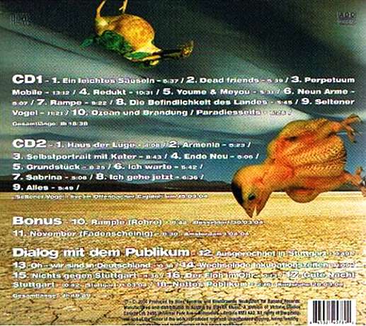 Tracklist: Ein leichtes leises Säuseln/ Dead Friends (Around the Corner)/ Perpetuum Mobile/ Redukt/ Youme & Meyou/ Neun Arme / Rampe/ Die Befindlichkeit des Landes/ Seltener Vogel/ Ozean und Brandung- Paradiesseits// Haus der Lüge/ Armenia/ Selbsportrait mit Kater/ Ende Neu/ Grundstück/ Ich warte (Rampe)/ Sabrina/ Ich gehe jetzt/ Alles/ Rohre (Rampe)/ November-Fadenscheinig (Rampe)/ Dialog mit dem Publikum #1/ Dialog mit dem Publikum #2.
