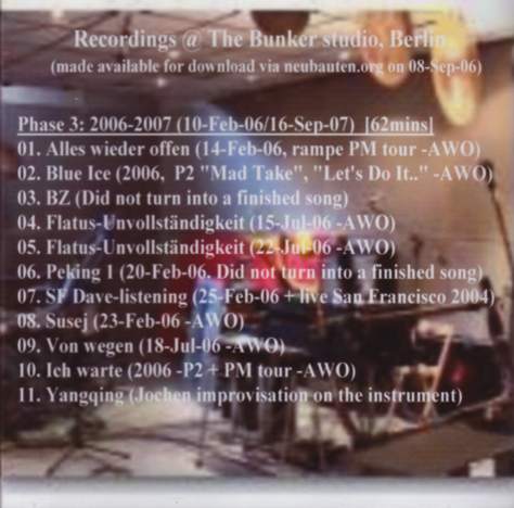 Notes: Unavailable. Tracks made available for download from neubauten.org during the recording sessions for the "Perpetuum Mobile", "Grundstück" and "Alles Wieder Offen" albums.