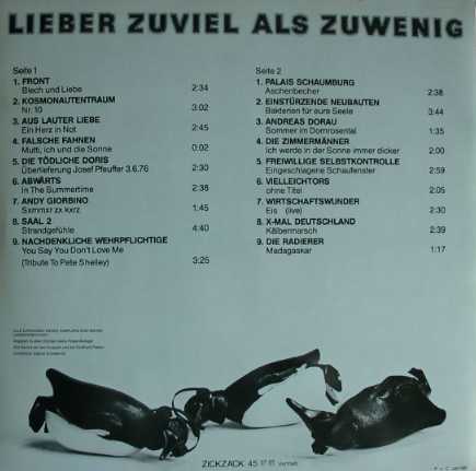 Info: Track 1: "Für den Untergang" 7"; track 2: "Lieber Zuviel Als Zuwenig" V/A compilation LP; tracks 3&7: "Monogam Sampler" LP; tracks 4,8&10: "Kalte Sterne" 2x7"; tracks 5&16: "Das Abendprogramm" V/A live compilation LP; track 6: "Kalt wie Eis" soundtrack LP; track 9: "Decoder" soundtrack LP/CD; track 11: "Song and Legend" V/A compilation LP; track 12: "Thirsty Animal" 12"; track 13: "Q.E.D." V/A compilation 2LP/CD; track 14: "Smack My Crack" V/A compilation LP/CD; track 15: "2x4" cassette/CD; track 17: "Halber Mensch" VHS video.