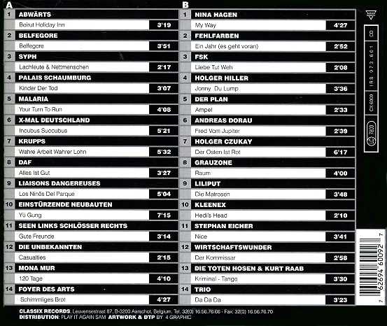 Notes: At the time of release this was an interesting (63mins) compilation of good quality. Now most tracks (except 6 & 13) are easily available. Track 11 is not by Neubauten, but by N.U. Unruh.